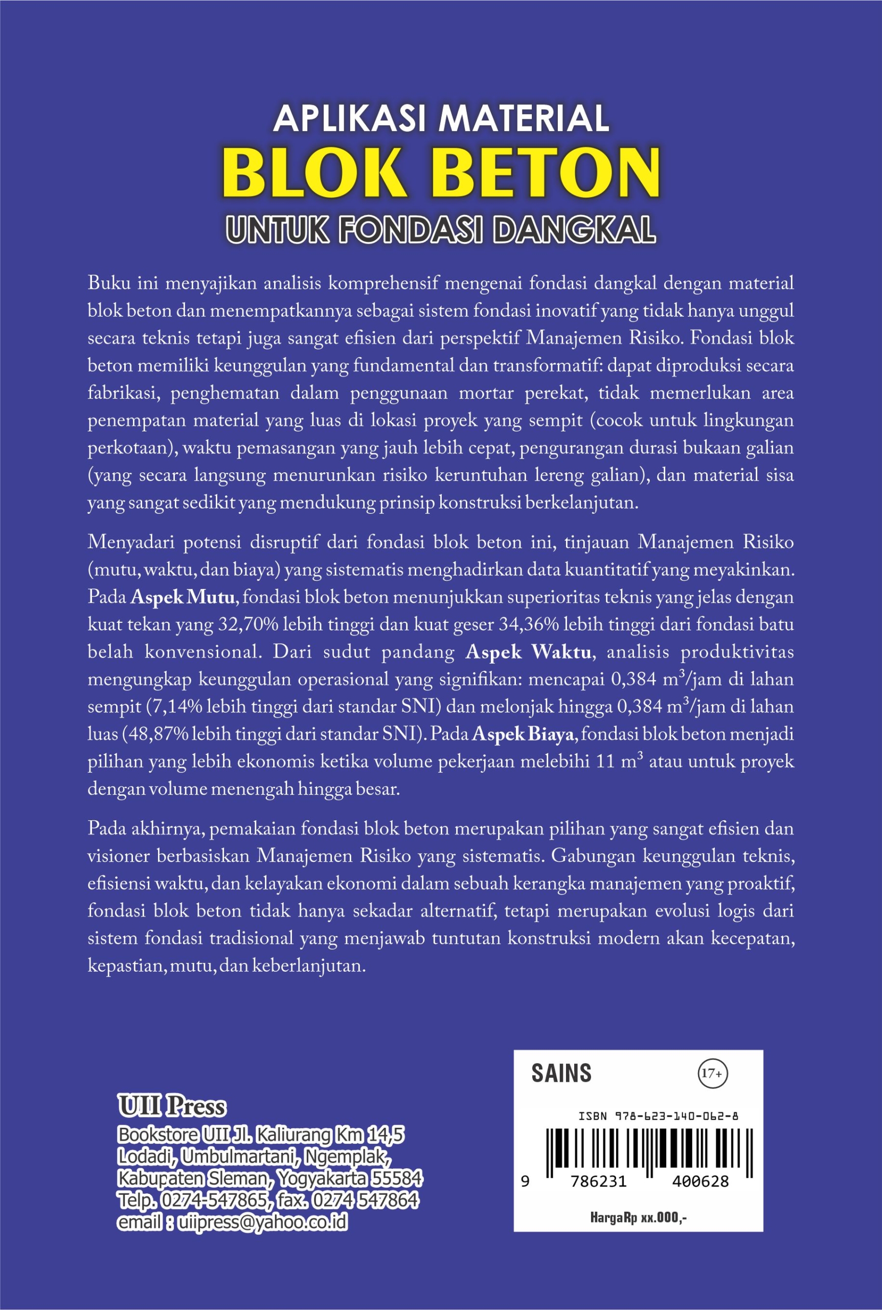 Buku ini menyajikan analisis komprehensif mengenai fondasi dangkal dengan material blok beton dan menempatkannya sebagai sistem fondasi inovatif yang tidak hanya unggul secara teknis tetapi juga sangat efisien dari perspektif Manajemen Risiko. Fondasi blok beton memiliki keunggulan yang fundamental dan transformatif: dapat diproduksi secara fabrikasi, penghematan dalam penggunaan mortar perekat, tidak memerlukan area penempatan material yang luas di lokasi proyek yang sempit (cocok untuk lingkungan perkotaan), waktu pemasangan yang jauh lebih cepat, pengurangan durasi bukaan galian (yang secara langsung menurunkan risiko keruntuhan lereng galian), dan material sisa yang sangat sedikit yang mendukung prinsip konstruksi berkelanjutan.