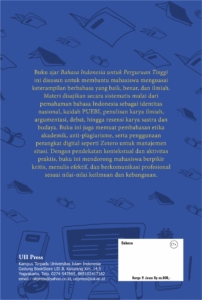 Buku ajar Bahasa Indonesia untuk Perguruan tinggi ini disusun untuk membantu mahasiswa menguasai keterampilan berbahasa yang baik, benar, dan ilmiah. Materi disajikan secara sistematis mulai dari pemahaman bahasa indonesia sebagai identitas nasional, kaidah PUEBI, penulisan karya ilmiah, argumentasi, debat, hingga resensi karya sastra dan budaya. Buku ini juga memuat pembahasan etika akademik, anti-plagiarisme, serta penggunaan perangkat digital seperti Zotero untuk manajemen sitasi. Dengan pendekatan kontekstual dan aktivitras praktis, buku ini mendorong mahasiswa berpikir kritis, menulis efektif, dan berkomunikasi profesional sesuai nilai-nilai keilmuan dan kebangsaan.